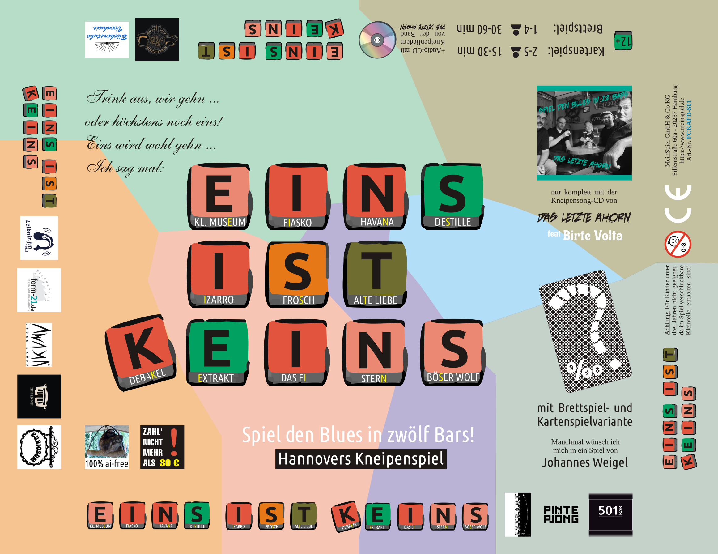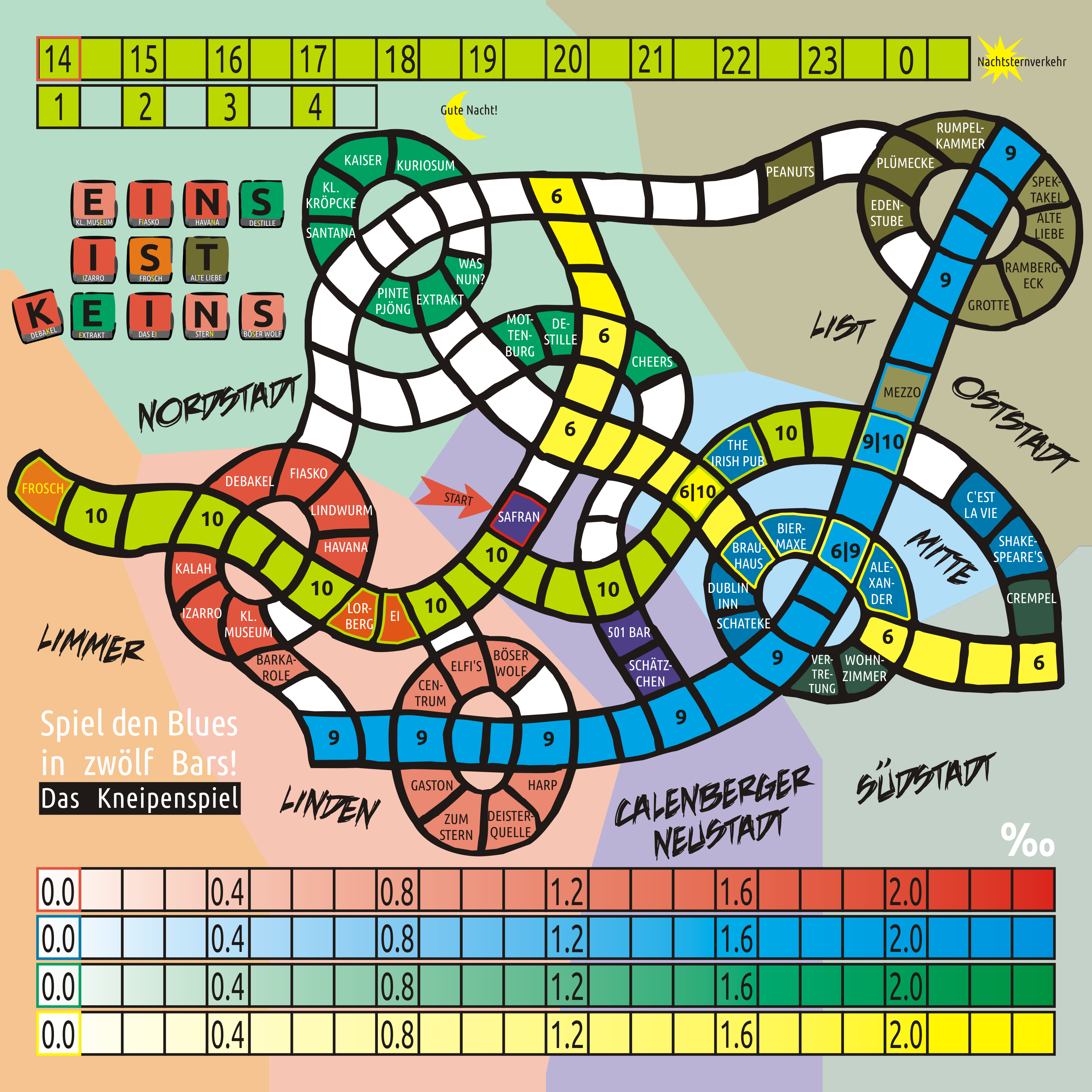 Eine Kneipentour durch Hannover ohne Nachwirkungen? Das gibt es bald als Brettspiel. Die Idee dazu kam durch das in Produktion befindliche Album „Spiel den Blues in zwölf Bars“ der Hannoverschen Rockband Das Letzte Ahorn, auf dem zwölf Kneipen in unterschiedlichen Stilrichtungen besungen werden. Es geht um das Frosch, das Debakel, das Fiasko (Tigris), das Havana Cuba-Linden, das Izarro, das Kleine Museum, das Ei, die Gaststätte zum Stern, die Destille, das Extrakt, die Alte Liebe und den bösen Wolf. Am Ende entstand rund um das Album ein Brettspiel mit sage und schreibe 50 Hannoverschen Bars und Kneipen, in dem es darum geht, bei einer Kneipentour Promille zu sammeln und möglichst viele verschiedene Kneipen zu besuchen.